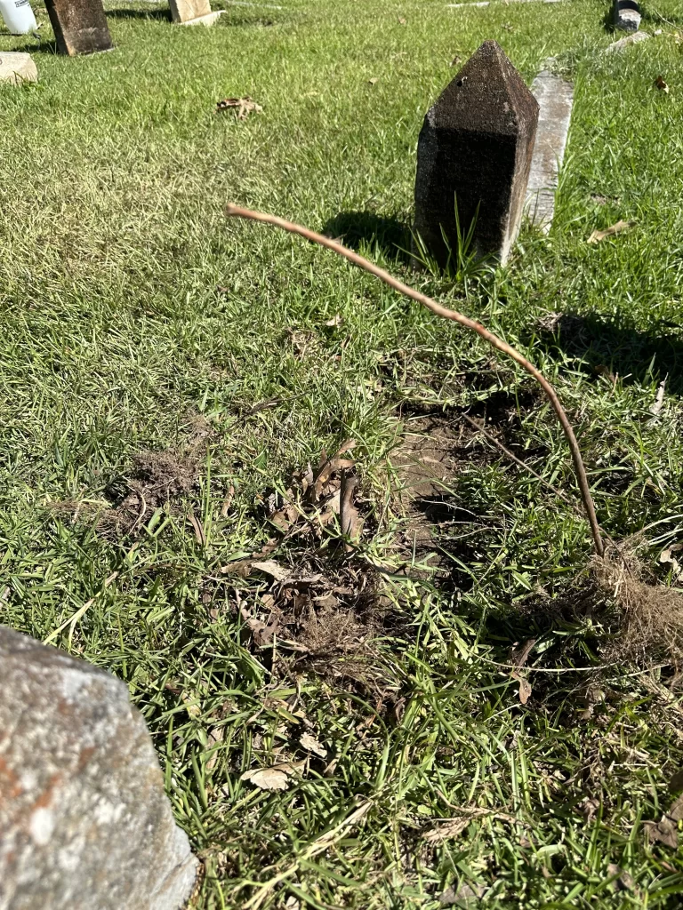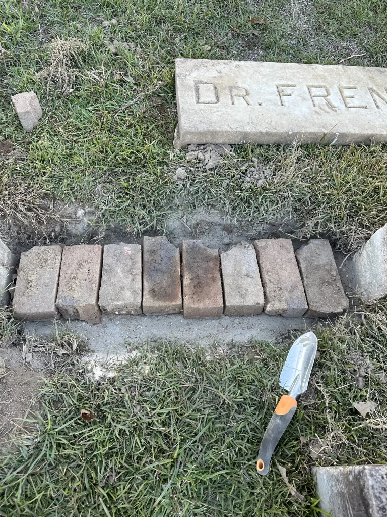 In case you missed my previous post, I have started work on the French Family Burial Plot at Bethesda Cemetery in Senatobia, Mississippi. As usual, I have probably taken on more than I can ever finish, but I enjoy the transformations way too much. I found something pretty neat while beginning the work on the coping surrounding this area. In the picture below, you will notice my tools in front of the entrance to the French lot. Between the two pointy markers is a threshold which I did not think much of because grass was there and it was insignificant to me until… I felt something hard underneath my feet. I started carefully moving the grass around this area.